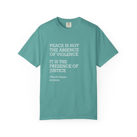 "Peace is not the absence of violence...It is the presence of justice" Mendi Hasan No Kings Speech, Activists Unisex T-Shirt, Comfort Colors 1717