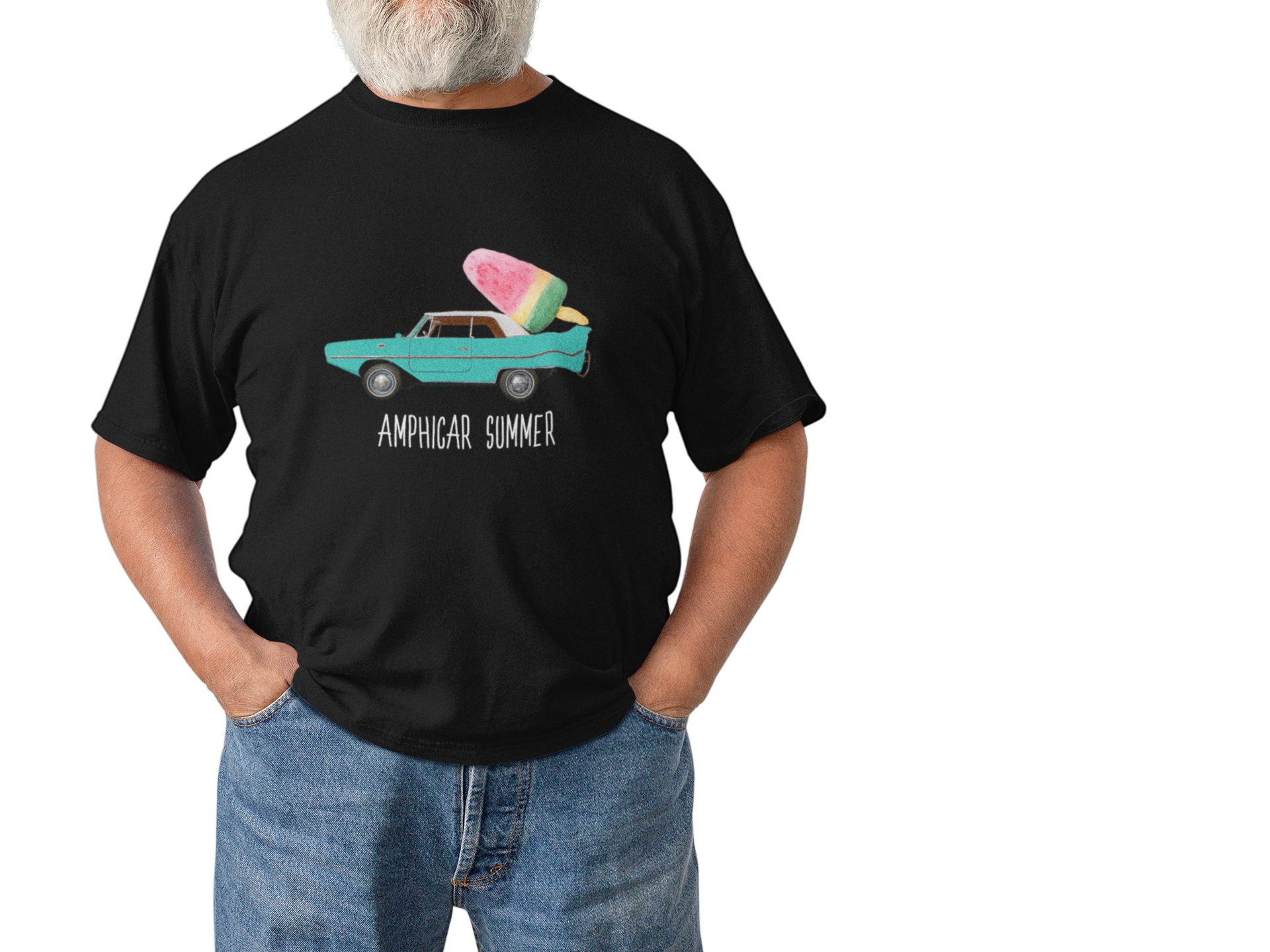 Unique Amphicar Design: Showcases a cool, vintage Fjord Green-colored Amphicar cruising with a colorful popsicle, perfect for those who love classic cars and summer fun. A fantastic present gift for him or her for Amphicar owners, classic car collectors and enthusiasts, boat lovers, or anyone who appreciates quirky, amphibious vehicles.