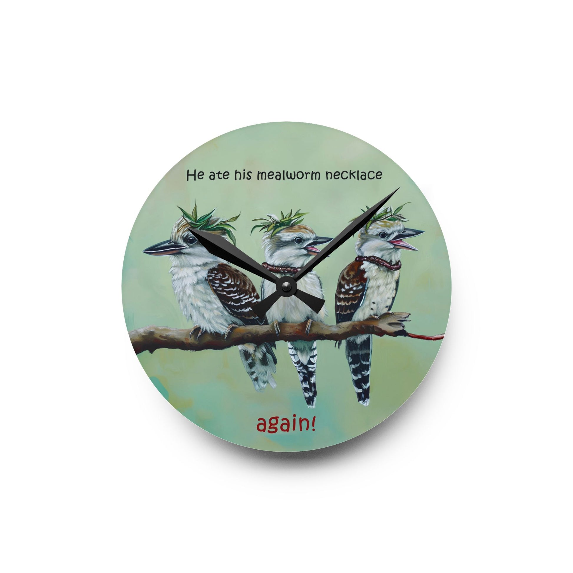 He Ate His Mealworm Necklace Again! Funny Kookaburra Acrylic Wall Clock, Unique Home Decor, Gift for Bird Lovers, Perfect for Bird Enthusiasts